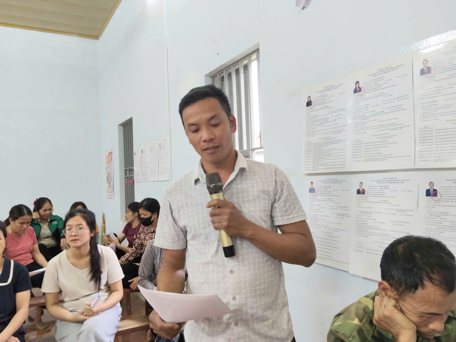 Đại diện lãnh đạo Ủy ban MTTQ Việt Nam xã giới thiệu tóm tắt tiểu sử của người ứng cử đại biểu HĐND xã khóa XXI