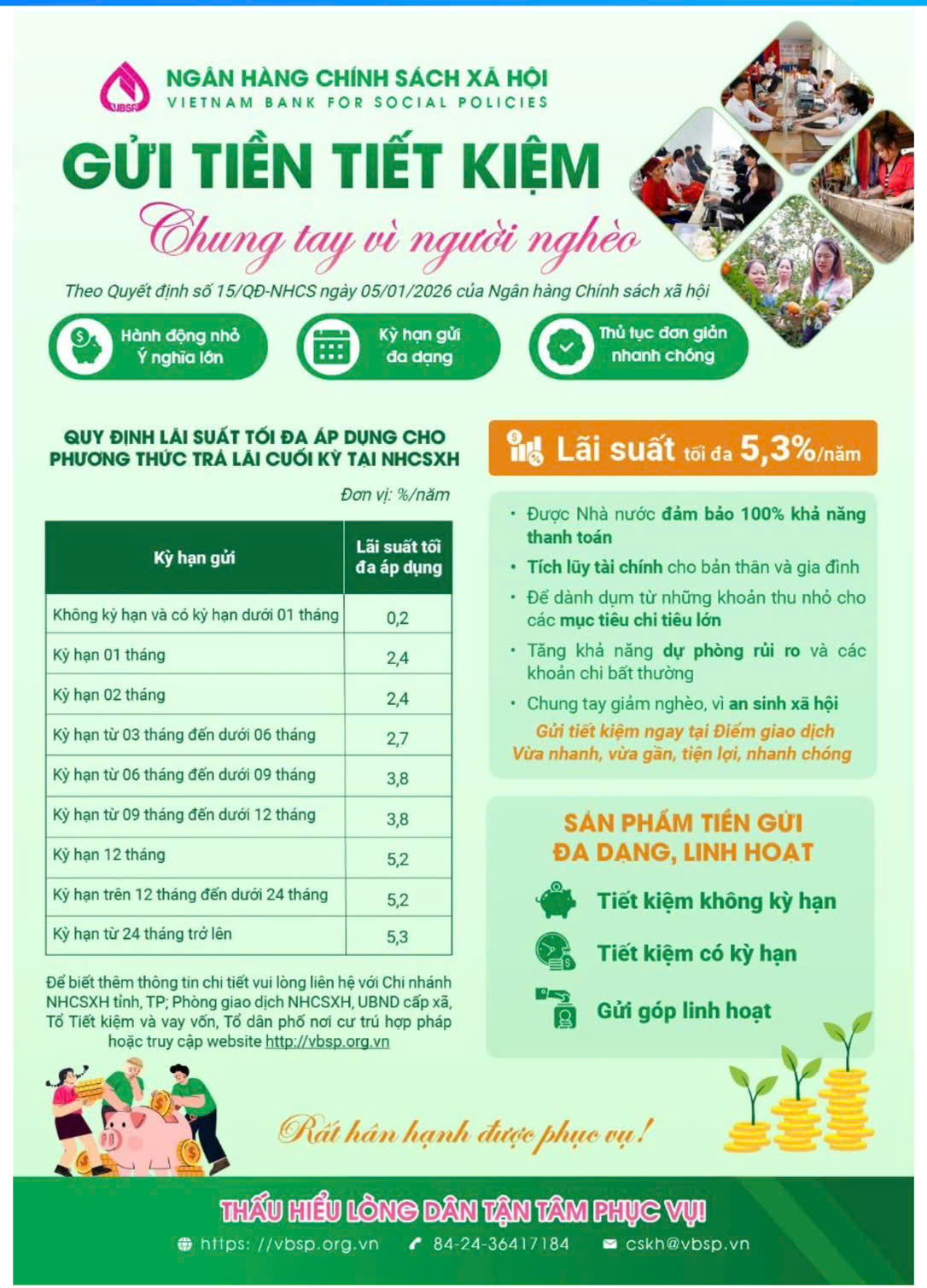 Đặc biệt mức lãi suất tiền gửi tiết kiệm của Ngân hàng Chính sách xã hội hiện tương đương với mức lãi suất huy động của các Ngân hàng thương mại trên cùng địa bàn.