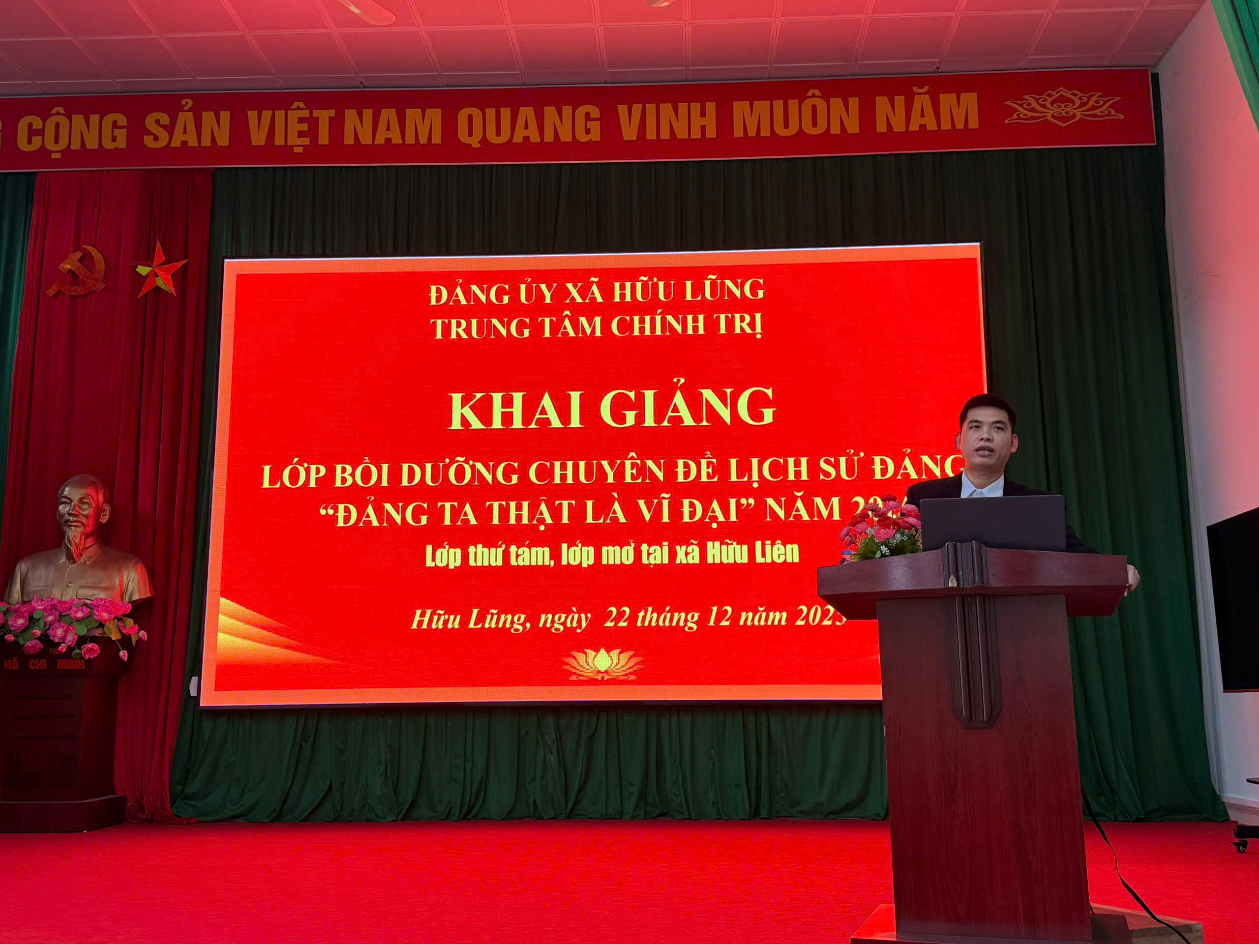 Chiều ngày 22/12/2025, tại Hội trường Nhà văn hóa xã Hữu Liên, Trung tâm Chính trị xã Hữu Lũng phối hợp với Đảng ủy xã Hữu Liên tổ chức khai giảng lớp Bồi dưỡng chuyên đề lịch sử Đảng – “Đảng ta thật là vĩ đại” năm 2025 dành cho cán bộ, đảng viên các chi bộ thôn trên địa bàn xã.