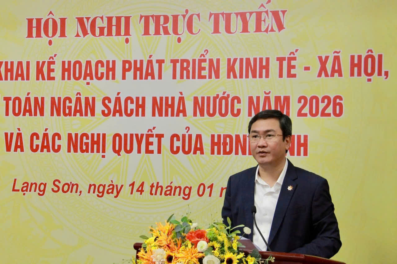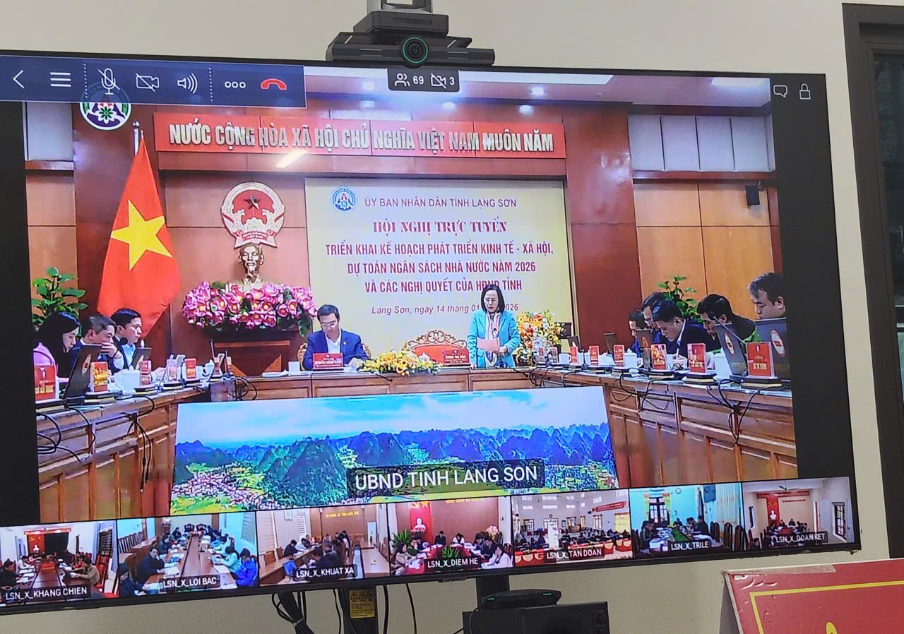 Chiều ngày 14/1, UBND tỉnh Lạng Sơn tổ chức Hội nghị trực tuyến triển khai kế hoạch phát triển kinh tế - xã hội, dự toán ngân sách nhà nước năm 2026 và các nghị quyết của HĐND tỉnh. Đồng chí Đoàn Thị Hậu, Phó Bí thư Thường trực Tỉnh ủy, Chủ tịch HĐND tỉnh dự và chỉ đạo hội nghị. Đồng chí Nguyễn Cảnh Toàn, Phó Bí thư Tỉnh ủy, Chủ tịch UBND tỉnh chủ trì hội nghị. Hội nghị được tổ chức theo hình thức trực tiếp kết hợp trực tuyến từ điểm cầu UBND tỉnh đến các xã, phường của tỉnh.