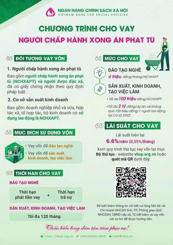 Về điều kiện vay vốn, Quyết định nêu rõ, người chấp hành xong án phạt tù có nhu cầu vay vốn; có tên trong danh sách người chấp hành xong án phạt tù về cư trú tại địa phương, chấp hành tốt các quy định của pháp luật, không tham gia các tệ nạn xã hội, do Công an cấp xã lập và được Ủy ban nhân dân cấp xã xác nhận. Thời gian kể từ khi chấp hành xong án phạt tù đến thời điểm vay vốn tối đa là 05 năm;