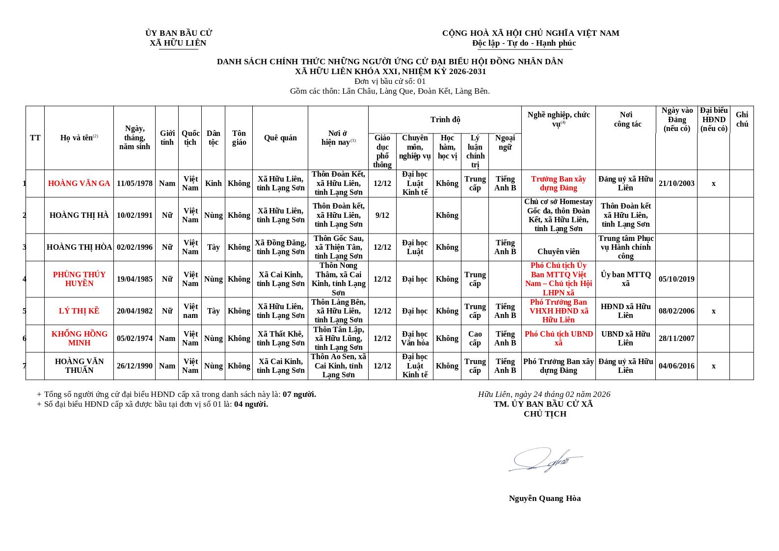 | Tiêu đề văn bản | DANH SÁCH CHÍNH THỨC NHỮNG NGƯỜI ỨNG CỬ ĐẠI BIỂU HỘI ĐỒNG NHÂN DÂN XÃ HỮU LIÊN KHÓA XXI, NHIỆM KỲ 2026-2031 | ||