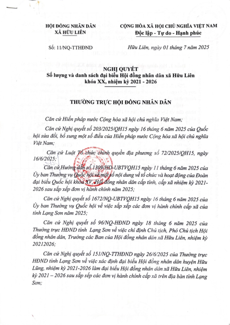 Tiêu đề văn bản | Nghị quyết số lượng và danh sách đại biểu Hội đồng nhân dân xã Hữu Liên khóa XX, nhiệm kỳ 2021-2026 | ||